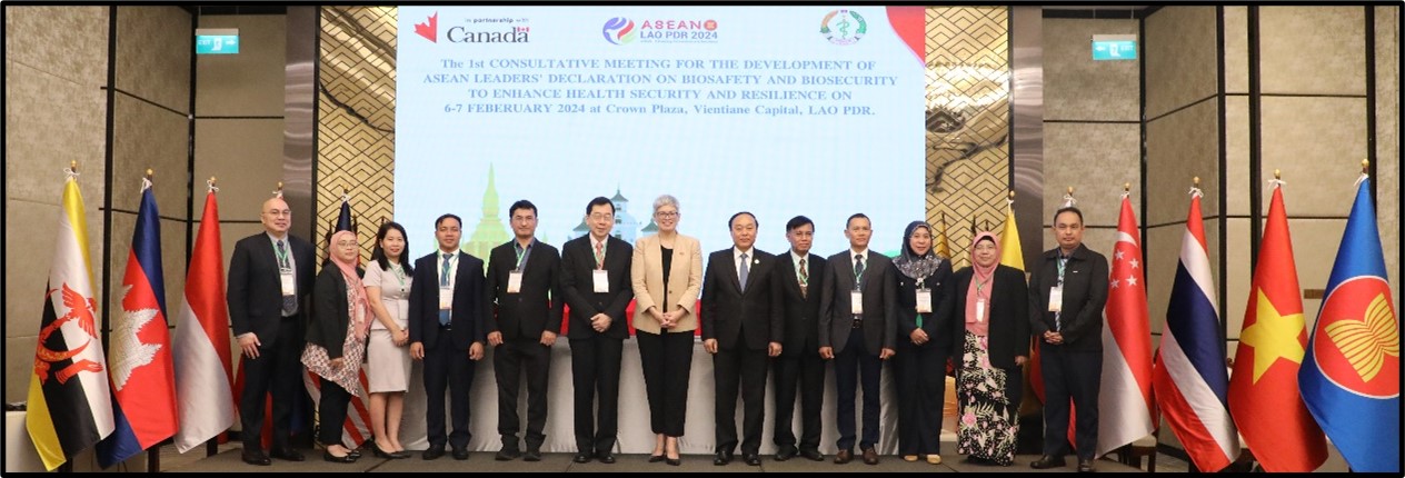 Dr. AthiwatPrimsirikunawut, Director of the Division of International Collaboration as Head of the Thai delegation, along with representatives from the National Institute of Health, Department of Medical Sciences, and the Office of International Cooperation, Department of Disease Control, attended the 1st Consultative Meeting on the Development of ASEAN Leaders’ Declaration on Biosafety and Biosecurity (การพัฒนาปฏิญญาผู้นำอาเซียนว่าด้วยความปลอดภัยและความมั่นคงทางชีวภาพ) from February 6th to 7th, 2024, at the Crowne Plaza Hotel in Vientiane, the Lao People’s Democratic Republic. The meeting included representatives from 10 ASEAN Member States (AMS), namely Brunei Darussalam, the Kingdom of Cambodia, the Republic of Indonesia, the Lao People’s Democratic Republic, Malaysia, the Republic of the Union of Myanmar, the Republic of the Philippines, the Republic of Singapore, the Kingdom of Thailand, and the Socialist Republic of Vietnam, as well as representatives from international cooperation organizations, including the World Health Organization (WHO), the Weapons Threat Reduction Program/Global Affairs Canada (GAC), the Public Health Agency of Canada (PHAC), and the International Federation of Biosafety Associations (IFBA). The objective of the consultation meeting was to comprehensively grasp and collect input from AMS and relevant stakeholders in the region regarding the requirements, gaps, and challenges in advancing biosafety and biosecurity measures. All inputs will be considered for the development of the Leaders’ Declaration that aims is to bolster both regional and national preparedness and response capabilities against biological threats and pandemics.