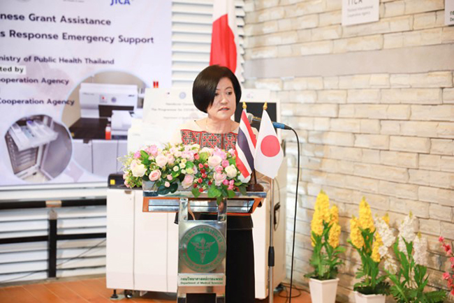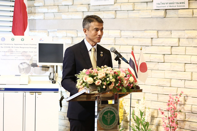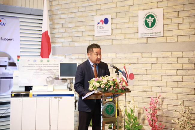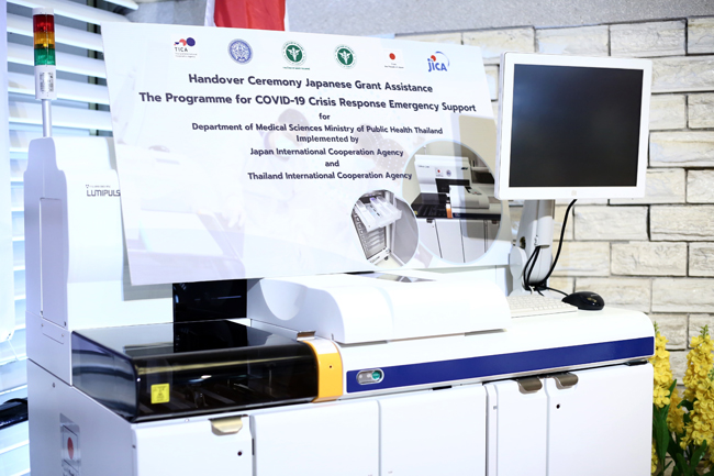 Dr. Supakit added that todays ceremony was honored by Mr. Yuichi Oba, Deputy Chief of Mission and Minister (Economic Affairs) of the Embassy of Japan to Thailand and Mr. Kazuya Suzuki, Chief Representative of the Japan International Cooperation Agency (JICA) Thailand Office, were represented the Government of Japan delivering laboratory equipment under the Japanese Grant Assistance the Programme for COVID-19 Crisis Response Emergency Support for the Department of Medical Sciences. The equipment consists of the Lumipulse G1200 instrument, which has a total budget of approximately 70 million Yen, worth over 16 million Baht, for COVID-19 antigen testing. This instrument is a Japanese technology that can be used to diagnose and monitor various diseases. Moreover, it can function to support the COVID-19 response under the Japanese Grant Assistance Program for COVID-19 Crisis Response Emergency Support at the National Institute of Health of Thailand (Thai NIH), Department of Medical Sciences, which plays the critical role as the reference laboratory of Thailand in the diagnosis of coronavirus disease 2019 (COVID-19), quality assurance of the laboratory network for research and development as well as collaborating with the disease prevention and control network contribute to the well-being of the people of Thailand.