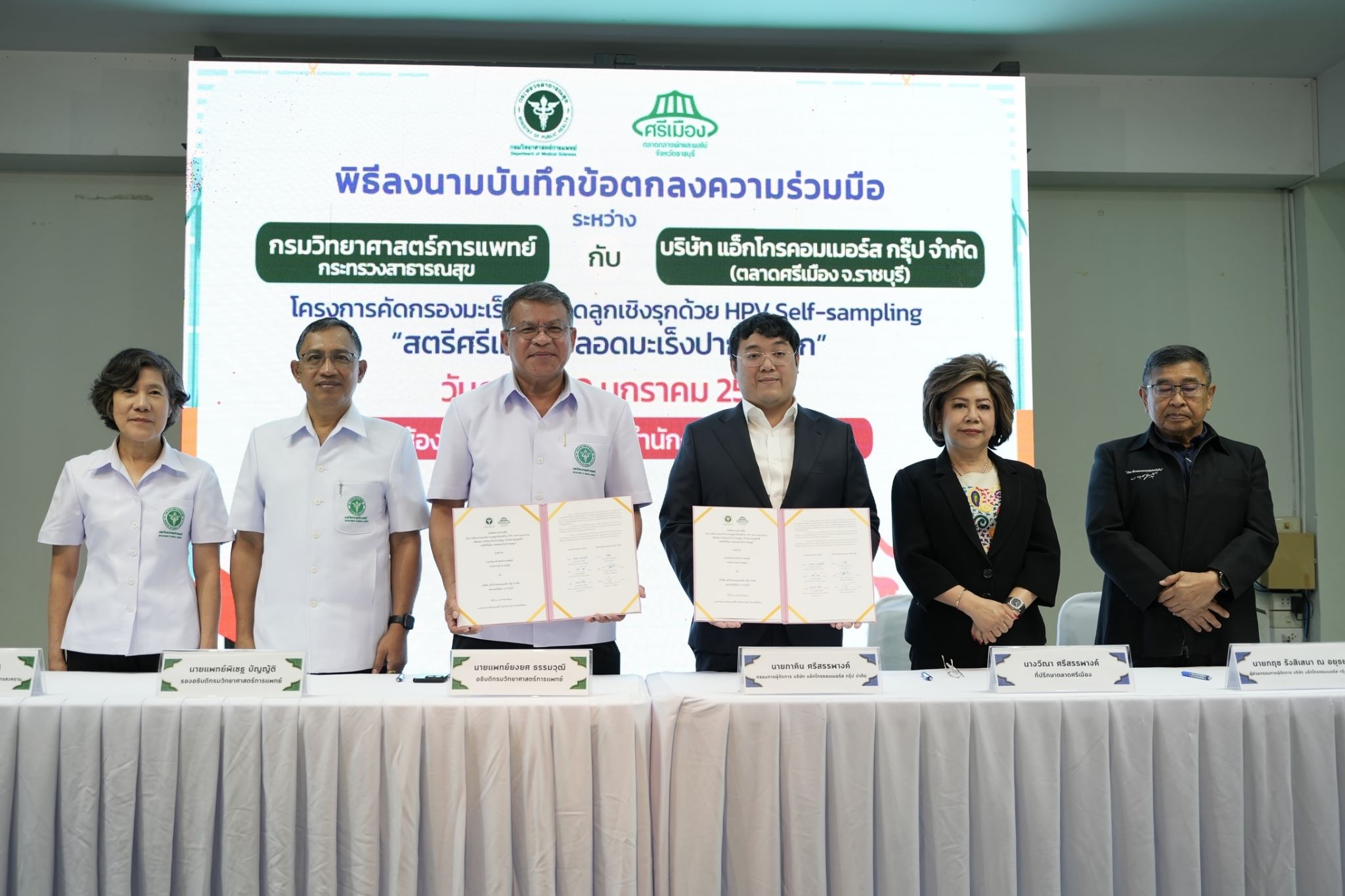 วันนี้ (10 มกราคม 2568) ที่ตลาดศรีเมือง จังหวัดราชบุรี นายแพทย์ยงยศ ธรรมวุฒิ อธิบดีกรมวิทยาศาสตร์การแพทย์ เป็นประธานในพิธีลงนามบันทึกข้อตกลงความร่วมมือระหว่างกรมวิทยาศาสตร์การแพทย์ โดยศูนย์วิทยาศาสตร์การแพทย์ที่ 5 สมุทรสงคราม กับนายภาคิน ศรีสรรพางค์ กรรมการผู้จัดการบริษัท แอ็กโกรคอมเมอร์ส กรุ๊ป จำกัด (ตลาดศรีเมือง จ.ราชบุรี) ในการคัดกรองมะเร็งปากมดลูกเชิงรุกด้วยวิธีเก็บตัวอย่างด้วยตนเอง (HPV Self-sampling) เพื่อลดการเกิดมะเร็งปากมดลูก ในหญิงไทยกลุ่มเป้าหมายในตลาดศรีเมือง “สตรีศรีเมือง ปลอดมะเร็งปากมดลูก” โดยมีนายแพทย์พิเชฐ บัญญัติ รองอธิบดีกรมวิทยาศาสตร์การแพทย์ นางปานทิพย์ ศิริโชติ ผู้อำนวยการศูนย์วิทยาศาสตร์การแพทย์ที่ 5 สมุทรสงคราม ผู้บริหารบริษัท แอ็กโกรคอมเมอร์ส กรุ๊ป จำกัด แพทย์หญิงปาจรีย์ อารีย์รบ นายแพทย์สาธารณสุขจังหวัดราชบุรี ผู้บริหารโรงพยาบาล และหน่วยงานที่เกี่ยวข้องในจังหวัดราชบุรี ร่วมเป็นสักขีพยาน ซึ่งภายในงานมีกิจกรรมการคัดกรองมะเร็งปากมดลูกเชิงรุกด้วยวิธีเก็บตัวอย่างด้วยตนเองกับแม่ค้า ประชาชนในพื้นที่