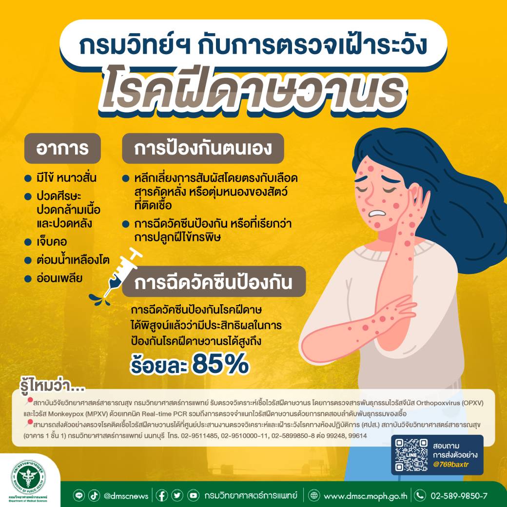 สถาบันวิจัยวิทยาศาสตร์สาธารณสุข กรมวิทยาศาสตร์การแพทย์ รับตรวจวิเคราะห์เชื้อไวรัสฝีดาษวานร โดยการตรวจสารพันธุกรรมไวรัสจีนัสOrthopoxvirus (OPXV) และไวรัส Monkeypox (MPXV) ด้วยเทคนิค Real-time PCR รวมถึงการตรวจจำแนกไวรัสฝีดาษวานรด้วยการทดสอบลำดับพันธุกรรมของเชื้อ