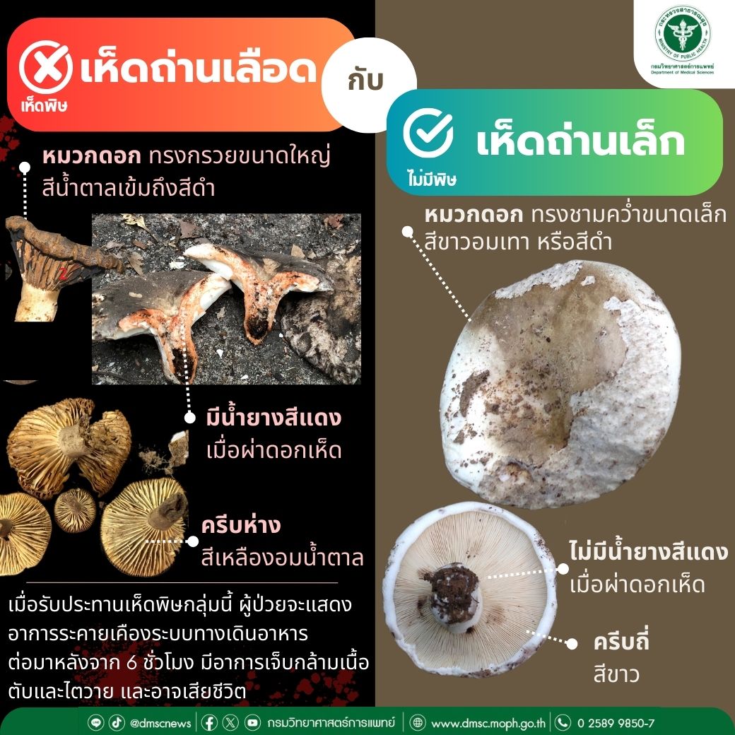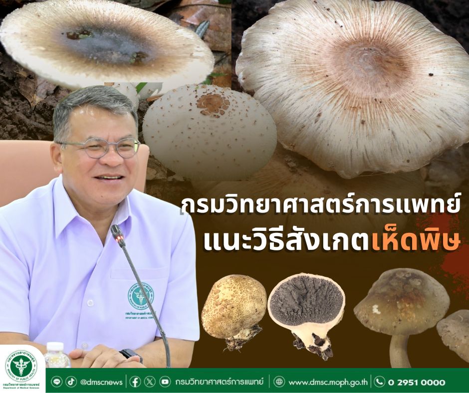 นายแพทย์ยงยศ ธรรมวุฒิ อธิบดีกรมวิทยาศาสตร์การแพทย์ เปิดเผยว่า ในช่วงหน้าฝนนี้ ศูนย์พิษวิทยา และฝ่ายศึกษาสายพันธุ์เชื้อราก่อโรค สถาบันวิจัยวิทยาศาสตร์สาธารณสุข กรมวิทยาศาสตร์การแพทย์ ได้รับตัวอย่างเพื่อตรวจวิเคราะห์ชนิดของเห็ด ซึ่งเป็นเห็ดที่มีผู้ป่วยรับประทานแล้วเข้าโรงพยาบาล โดยมีเห็ดพิษที่ส่งตรวจยืนยันในช่วงหน้าฝนนี้ ได้แก่ เห็ดระโงกหินหรือเห็ดระงากขาว เห็ดระงากหมวกดำ เห็ดถ่านเลือด เห็ดหมวกจีน เห็ดคันร่มพิษ เห็ดหัวกรวดครีบเขียว ซึ่งเห็ดพิษบางชนิดจะมีลักษณะคล้ายกับเห็ดที่รับประทานได้ ดังนั้นกรมวิทยาศาสตร์การแพทย์จึงมีวิธีคัดแยกเบื้องต้นในการจำแนกเห็ดพิษกับเห็ดไม่มีพิษ ดังนี้