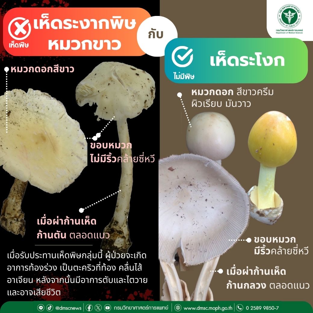 ❌ เห็ดระโงกหินหรือเห็ดระงากขาวและเห็ดระงากหมวกสีดำ สร้างพิษกลุ่ม Amatoxins เมื่อรับประทานเห็ดพิษกลุ่มนี้ผู้ป่วยจะเกิดอาการภายใน 6-24 ชั่วโมง มีอาการท้องร่วง เป็นตะคริวที่ท้อง คลื่นไส้ อาเจียนแสดงอาการประมาณ 1 วัน หลังจากนั้นมีอาการตับและไตวายและอาจเสียชีวิต วิธีการคัดแยก เห็ดระโงกหิน หรือ เห็ดระงากขาวและเห็ดระงากหมวกสีดำ มีพิษ ผิวหมวกเห็ดบริเวณขอบหมวกไม่มีริ้วคล้ายซี่หวี และก้านตันตลอดแนวเมื่อผ่าก้านเห็ด เห็ดระโงกขาวที่รับประทานได้ ผิวหมวกเห็ดสีขาวครีม สีเหลือง ผิวเรียบมันวาว ขอบหมวกมีริ้วคล้ายซี่หวีและก้านกลวงตลอดแนวเมื่อผ่าก้านเห็ด ในกรณีของเห็ดระโงกไส้เดือนหรือเห็ด