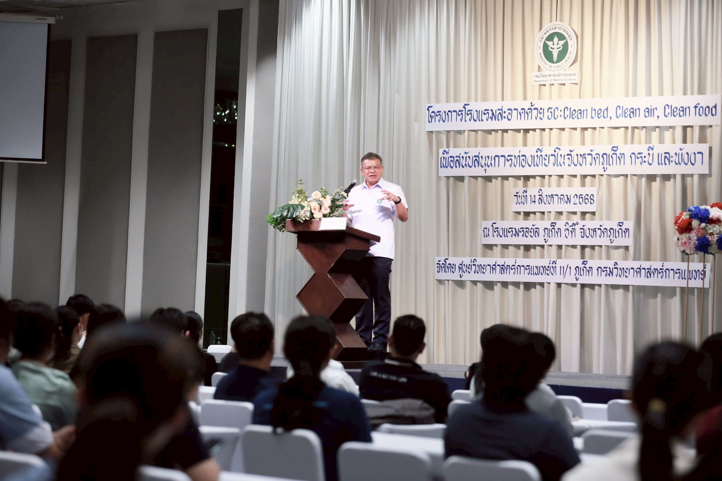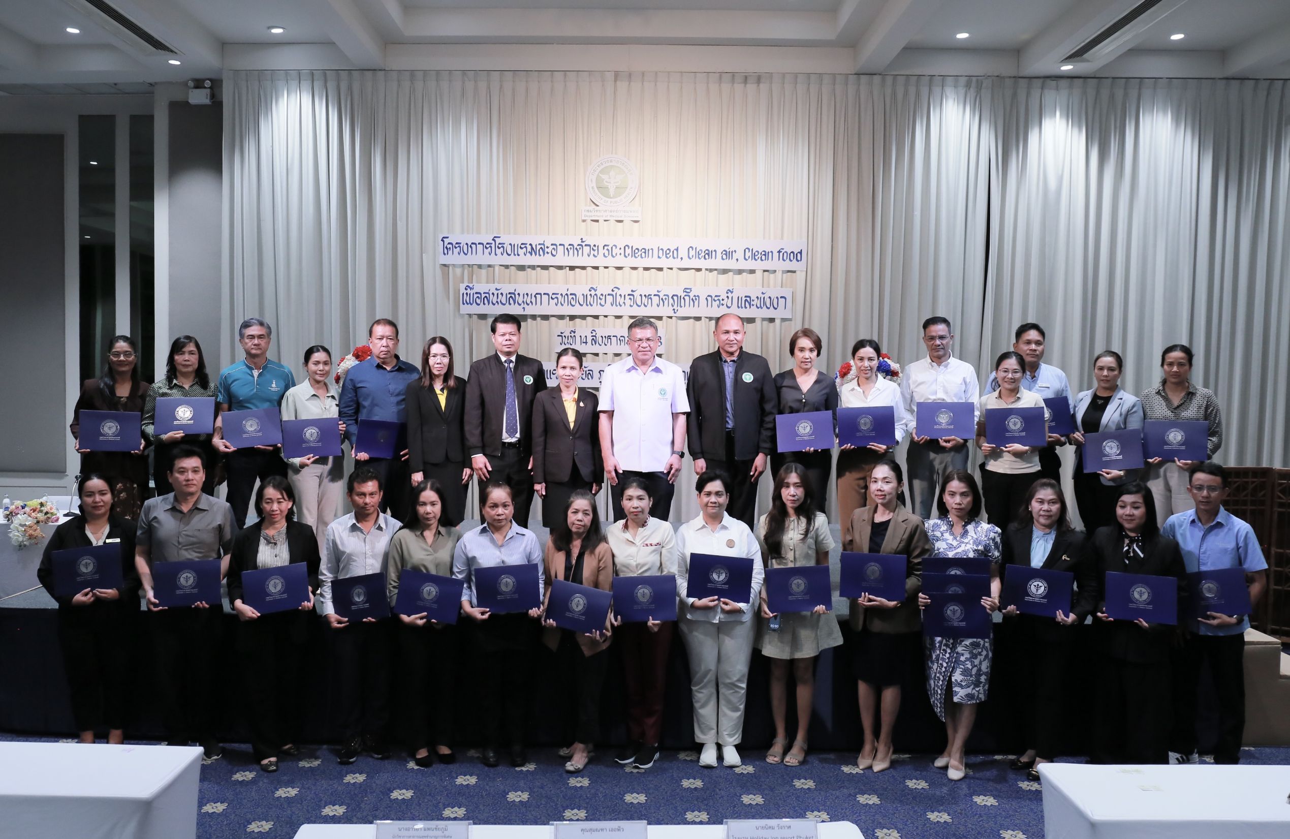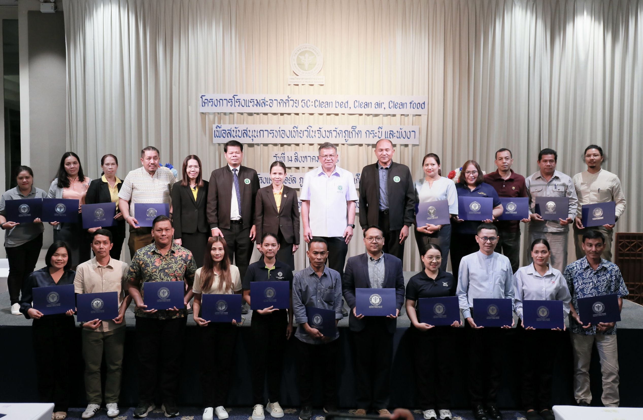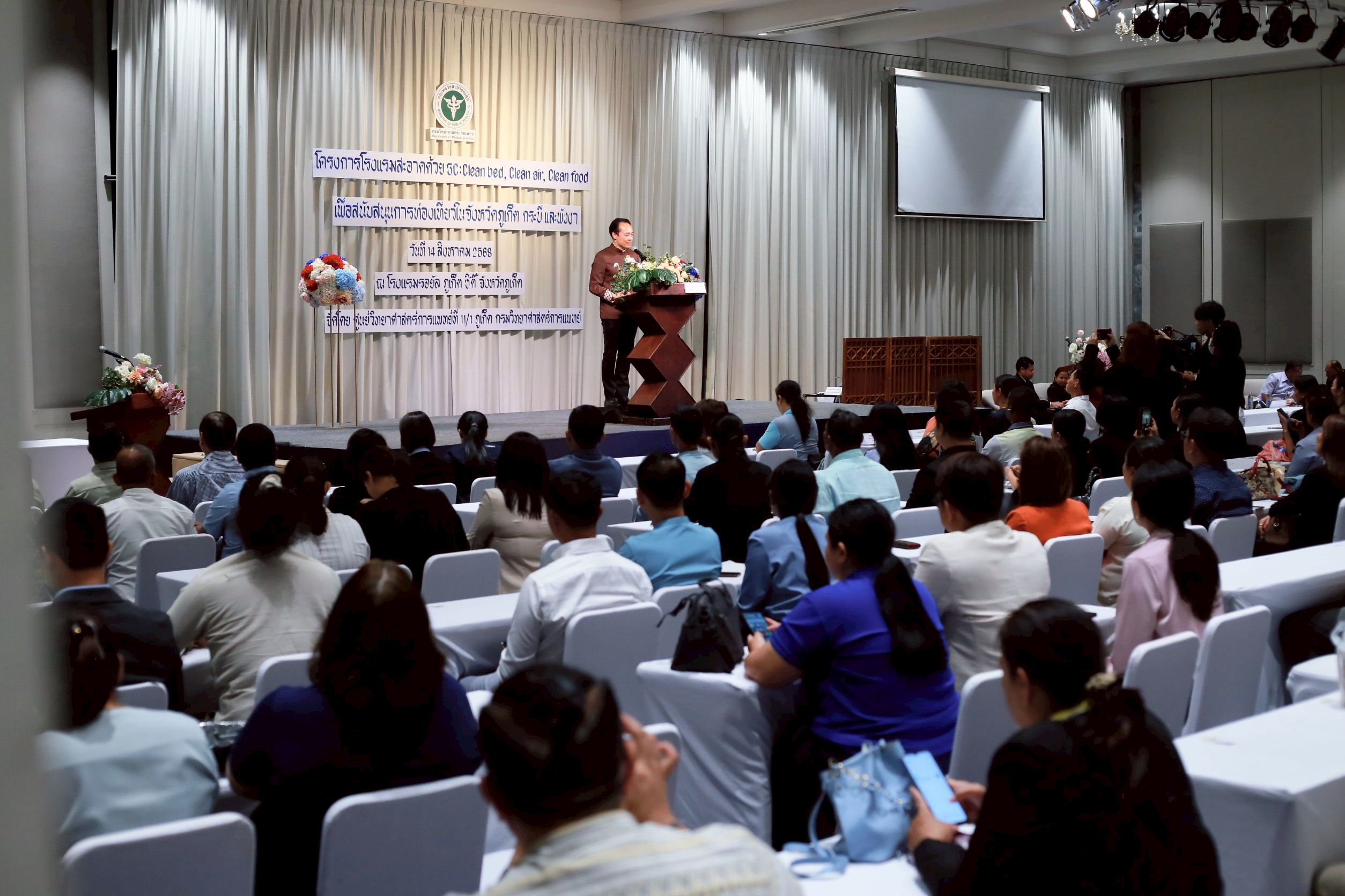 วันนี้ (14 สิงหาคม 2568) นายแพทย์ยงยศ ธรรมวุฒิ อธิบดีกรมวิทยาศาสตร์การแพทย์ เป็นประธานเปิด “โครงการโรงแรมสะอาดด้วย 3C : Clean bed, Clean air, Clean food เพื่อสนับสนุนการท่องเที่ยวในจังหวัดภูเก็ต กระบี่ และพังงา ประจำปี พ.ศ. 2568” พร้อมมอบประกาศนียบัตรให้กับโรงแรมที่ผ่านการตรวจเฝ้าระวังตัวเรือด เชื้อลีจิโอเนลลา และเชื้อไวรัสโนโร โดยมี นายสมาวิษฎ์ สุพรรณไพ รองผู้ว่าราชการจังหวัดภูเก็ต นายแพทย์สุทธิพจน์ ชยณัฐพงศ์ นายแพทย์สาธารณสุขจังหวัดภูเก็ต นางทรรศนีย์ ฉุ้นประดับ ผู้อำนวยการศูนย์วิทยาศาสตร์การแพทย์ที่ 11/1 ภูเก็ต ผู้บริหาร เจ้าหน้าที่หน่วยงานภาคีเครือข่ายที่เกี่ยวข้อง ผู้ประกอบการโรงแรมในพื้นที่จังหวัดภูเก็ต กระบี่ และพังงา เข้าร่วมงาน ณ โรงแรมรอยัล ภูเก็ต ซิตี้ จังหวัดภูเก็ต