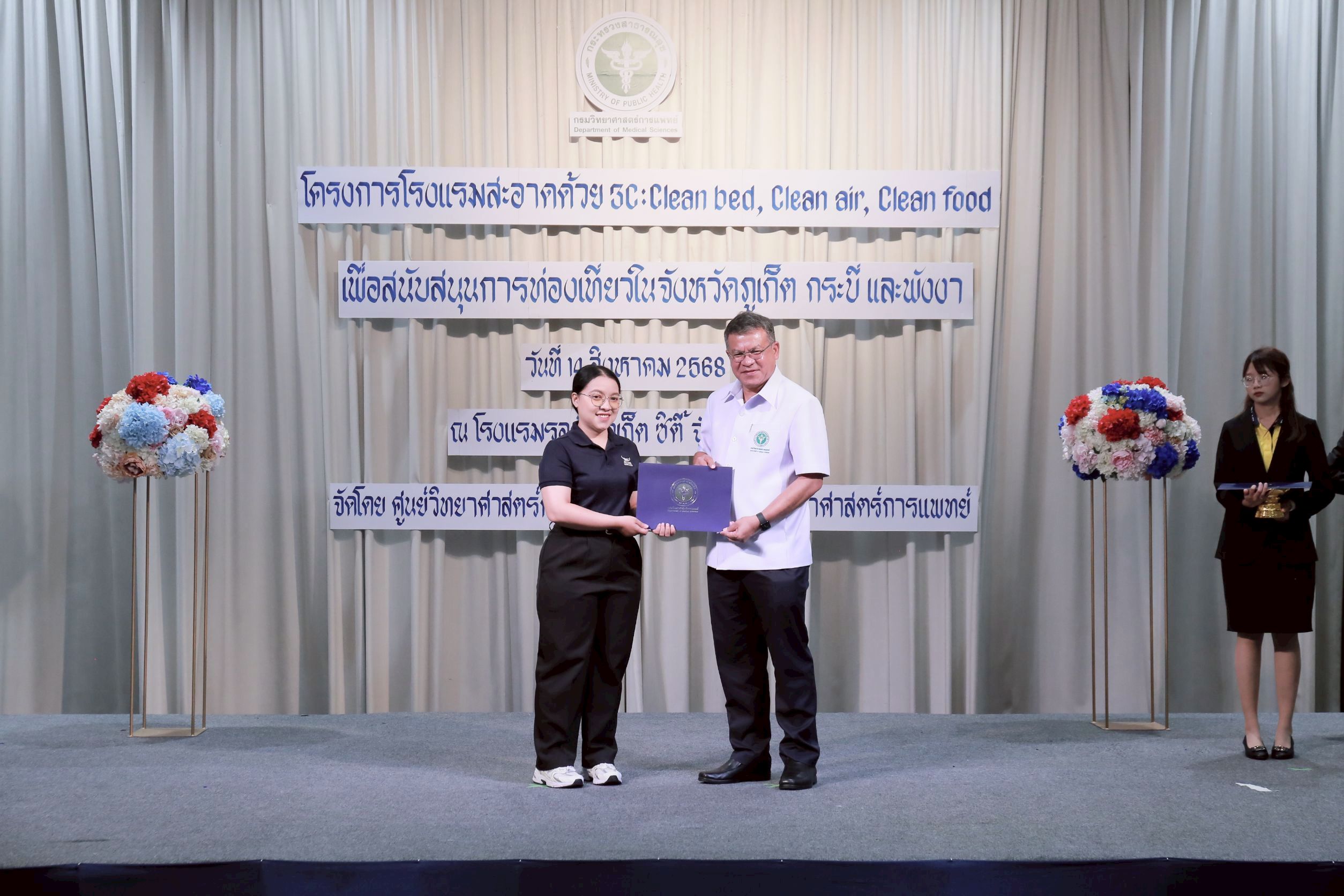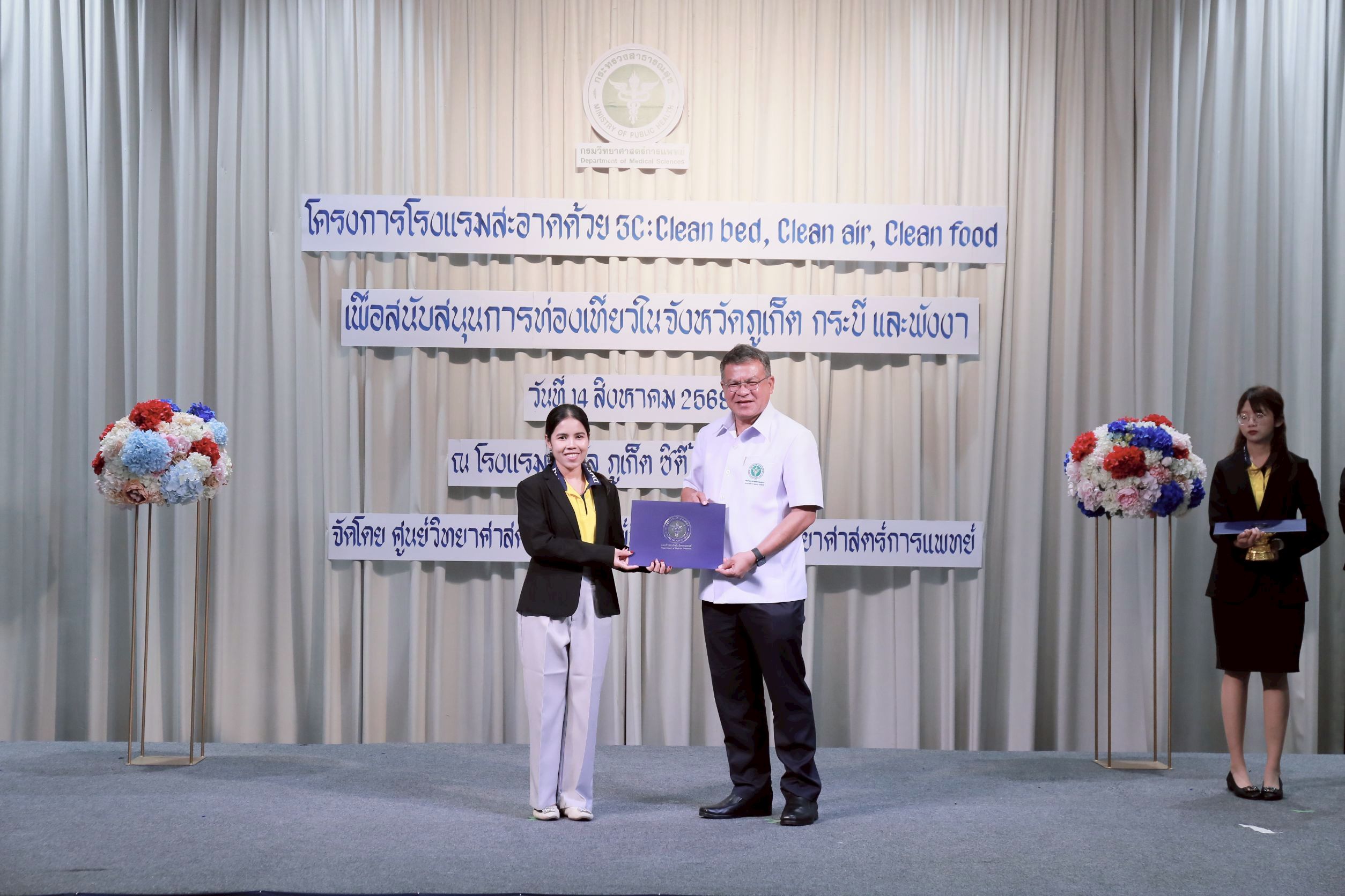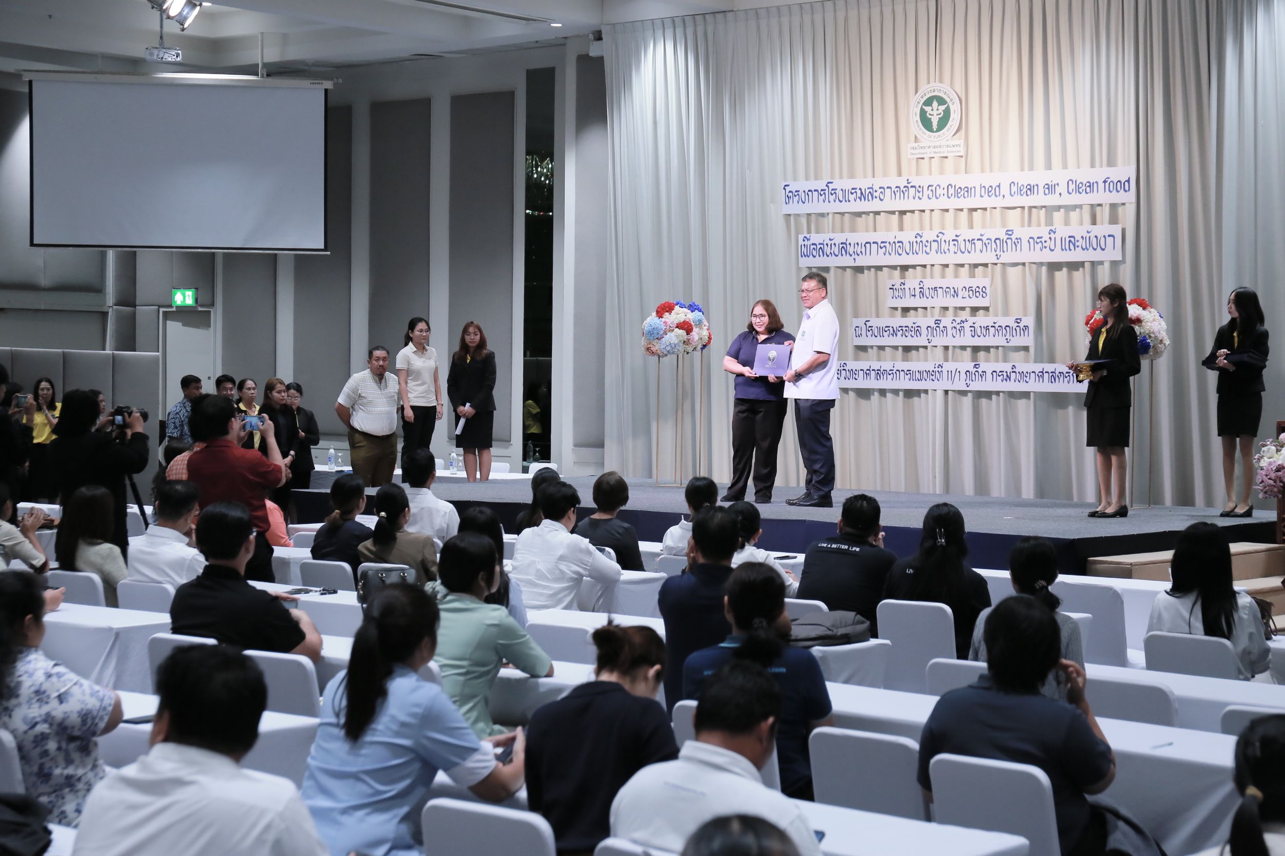 วันนี้ (14 สิงหาคม 2568) นายแพทย์ยงยศ ธรรมวุฒิ อธิบดีกรมวิทยาศาสตร์การแพทย์ เป็นประธานเปิด “โครงการโรงแรมสะอาดด้วย 3C : Clean bed, Clean air, Clean food เพื่อสนับสนุนการท่องเที่ยวในจังหวัดภูเก็ต กระบี่ และพังงา ประจำปี พ.ศ. 2568” พร้อมมอบประกาศนียบัตรให้กับโรงแรมที่ผ่านการตรวจเฝ้าระวังตัวเรือด เชื้อลีจิโอเนลลา และเชื้อไวรัสโนโร โดยมี นายสมาวิษฎ์ สุพรรณไพ รองผู้ว่าราชการจังหวัดภูเก็ต นายแพทย์สุทธิพจน์ ชยณัฐพงศ์ นายแพทย์สาธารณสุขจังหวัดภูเก็ต นางทรรศนีย์ ฉุ้นประดับ ผู้อำนวยการศูนย์วิทยาศาสตร์การแพทย์ที่ 11/1 ภูเก็ต ผู้บริหาร เจ้าหน้าที่หน่วยงานภาคีเครือข่ายที่เกี่ยวข้อง ผู้ประกอบการโรงแรมในพื้นที่จังหวัดภูเก็ต กระบี่ และพังงา เข้าร่วมงาน ณ โรงแรมรอยัล ภูเก็ต ซิตี้ จังหวัดภูเก็ต
