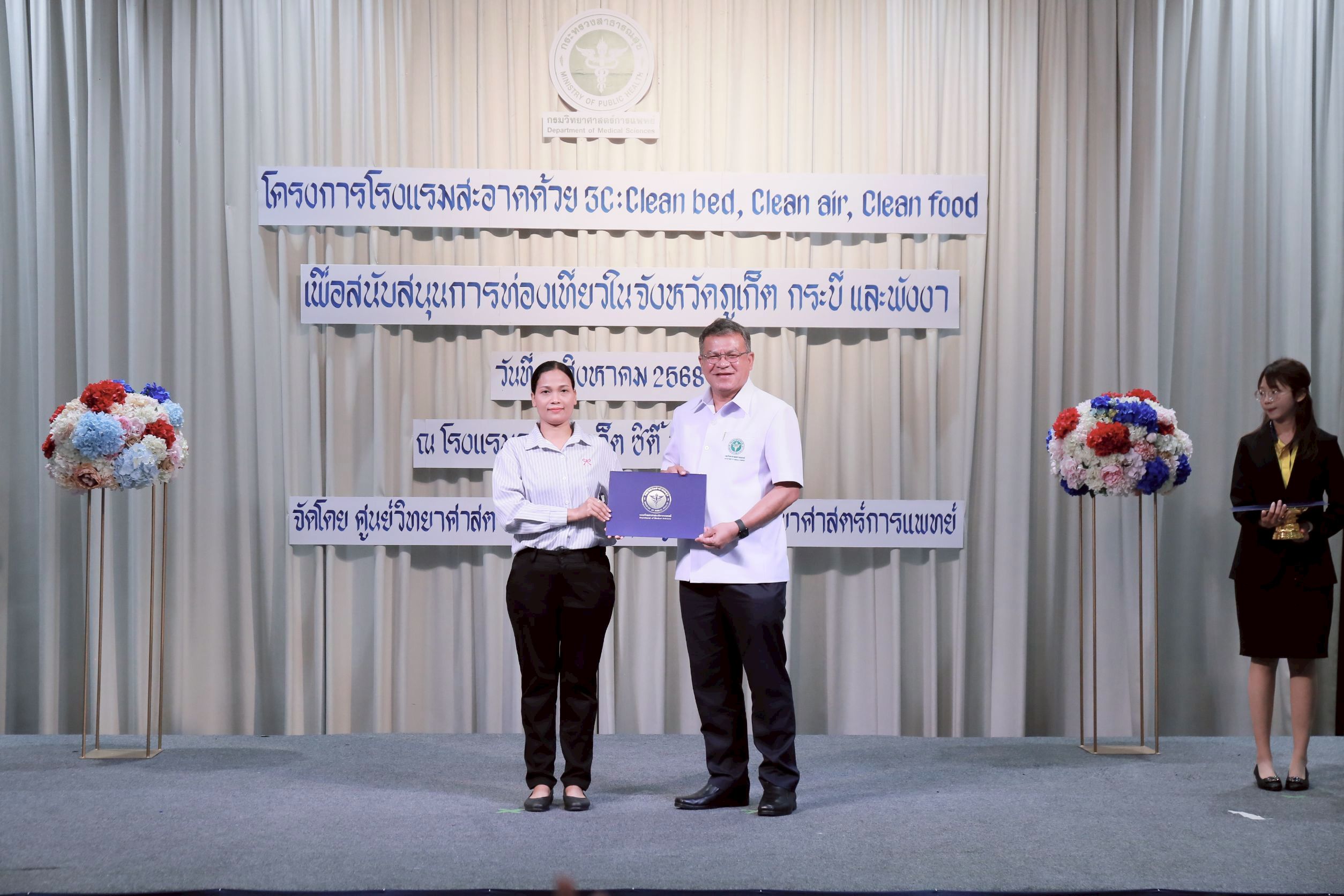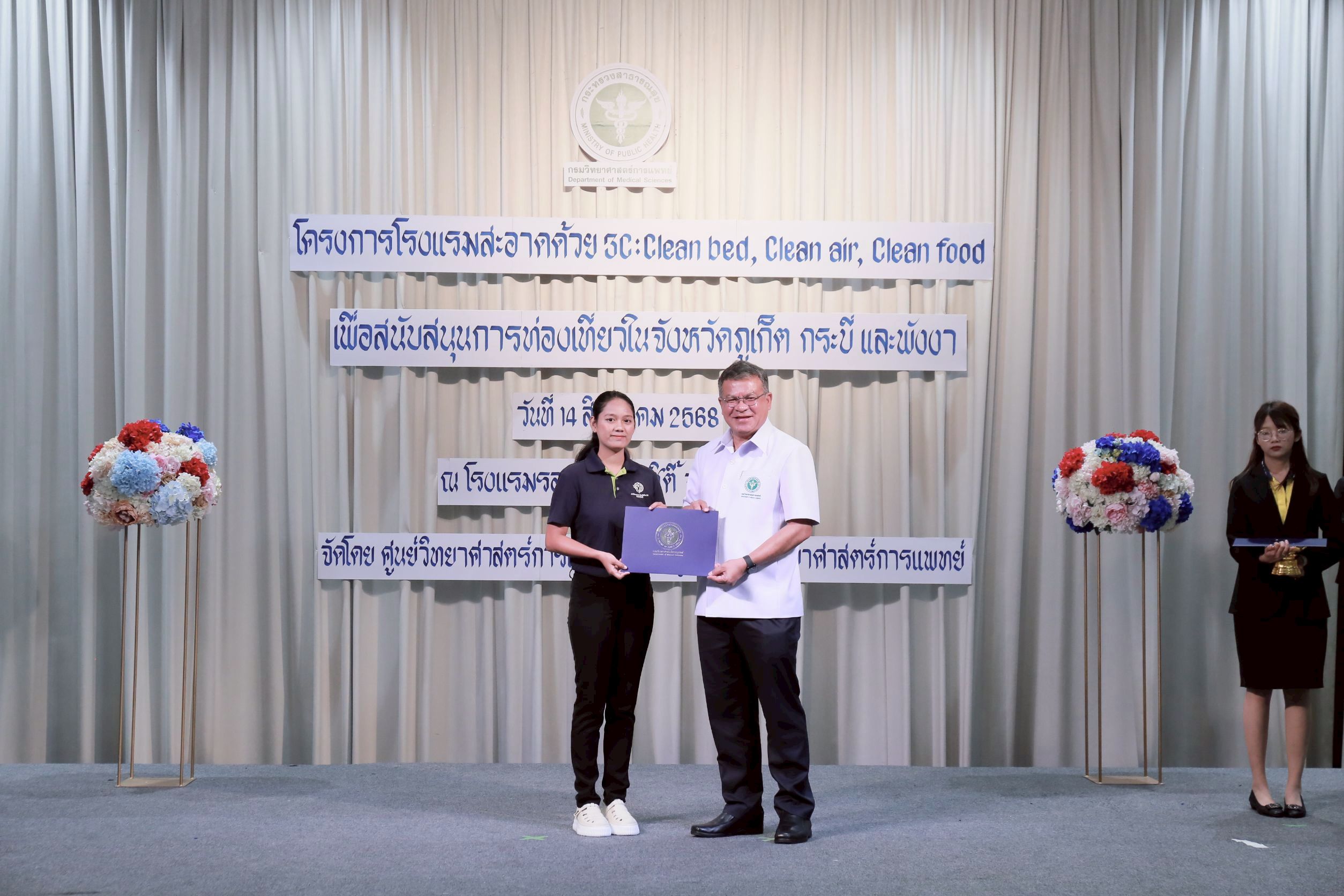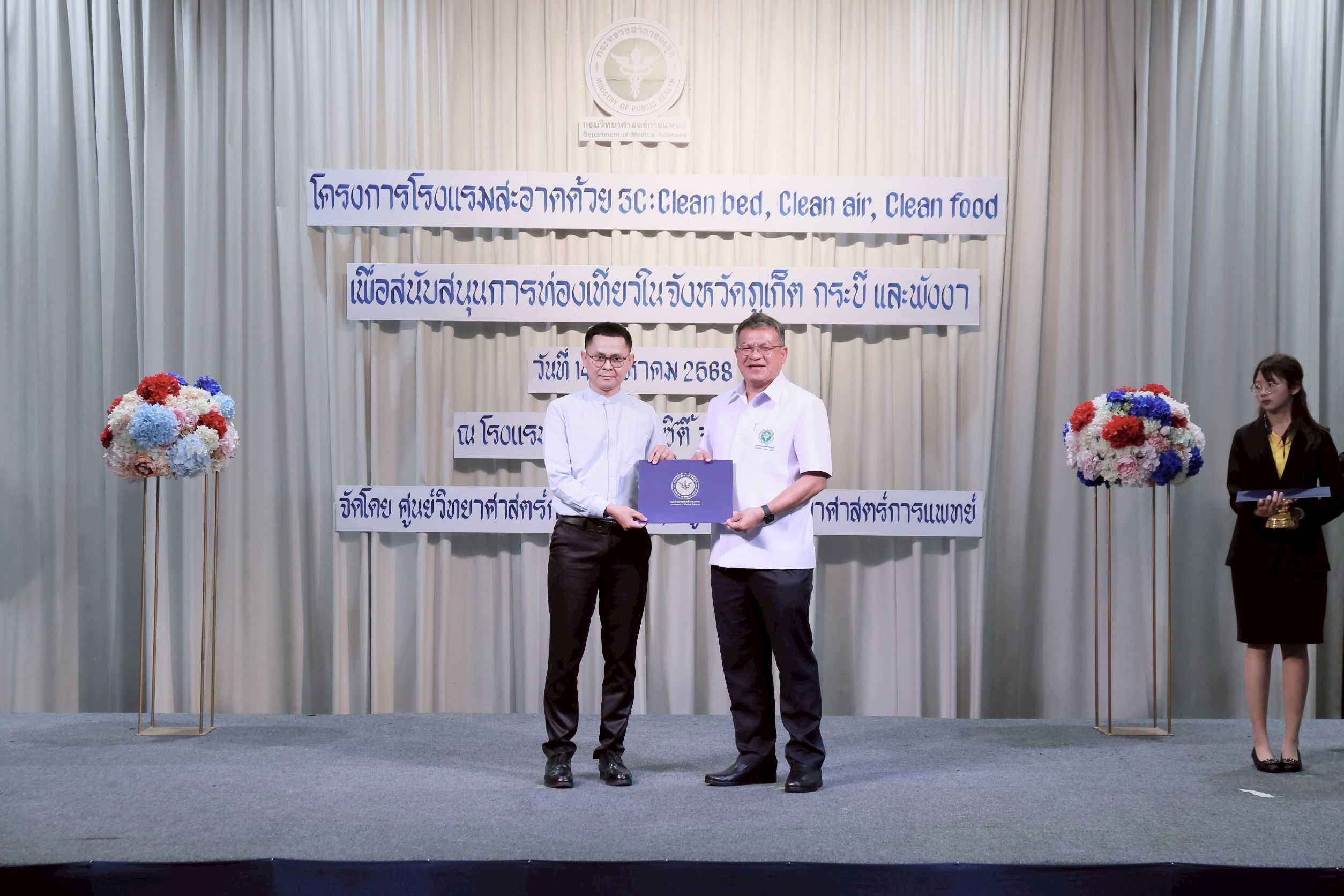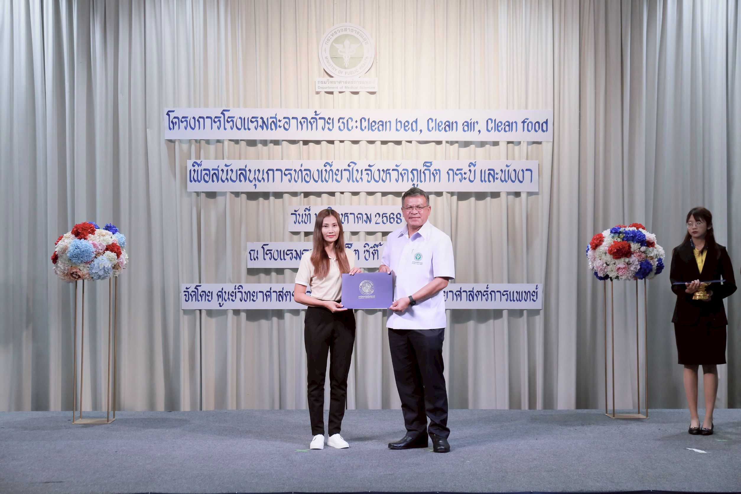 วันนี้ (14 สิงหาคม 2568) นายแพทย์ยงยศ ธรรมวุฒิ อธิบดีกรมวิทยาศาสตร์การแพทย์ เป็นประธานเปิด “โครงการโรงแรมสะอาดด้วย 3C : Clean bed, Clean air, Clean food เพื่อสนับสนุนการท่องเที่ยวในจังหวัดภูเก็ต กระบี่ และพังงา ประจำปี พ.ศ. 2568” พร้อมมอบประกาศนียบัตรให้กับโรงแรมที่ผ่านการตรวจเฝ้าระวังตัวเรือด เชื้อลีจิโอเนลลา และเชื้อไวรัสโนโร โดยมี นายสมาวิษฎ์ สุพรรณไพ รองผู้ว่าราชการจังหวัดภูเก็ต นายแพทย์สุทธิพจน์ ชยณัฐพงศ์ นายแพทย์สาธารณสุขจังหวัดภูเก็ต นางทรรศนีย์ ฉุ้นประดับ ผู้อำนวยการศูนย์วิทยาศาสตร์การแพทย์ที่ 11/1 ภูเก็ต ผู้บริหาร เจ้าหน้าที่หน่วยงานภาคีเครือข่ายที่เกี่ยวข้อง ผู้ประกอบการโรงแรมในพื้นที่จังหวัดภูเก็ต กระบี่ และพังงา เข้าร่วมงาน ณ โรงแรมรอยัล ภูเก็ต ซิตี้ จังหวัดภูเก็ต