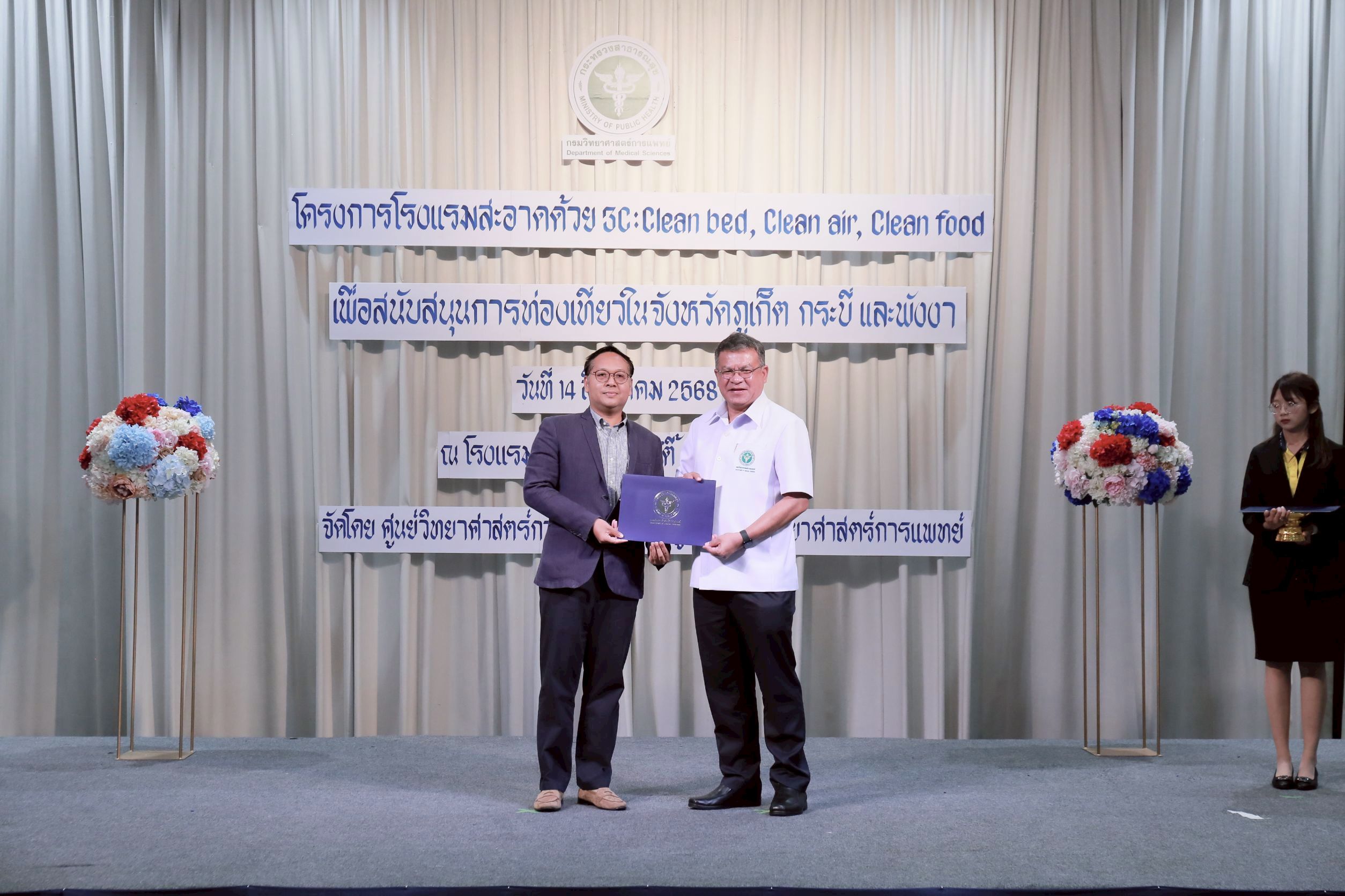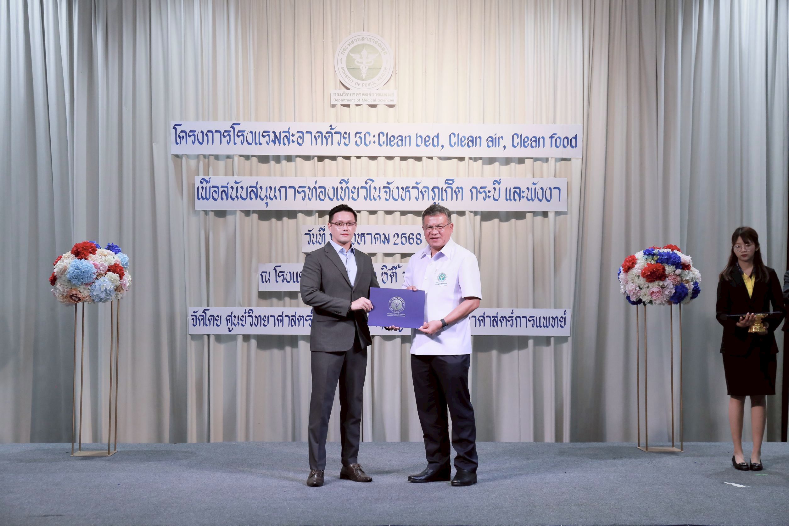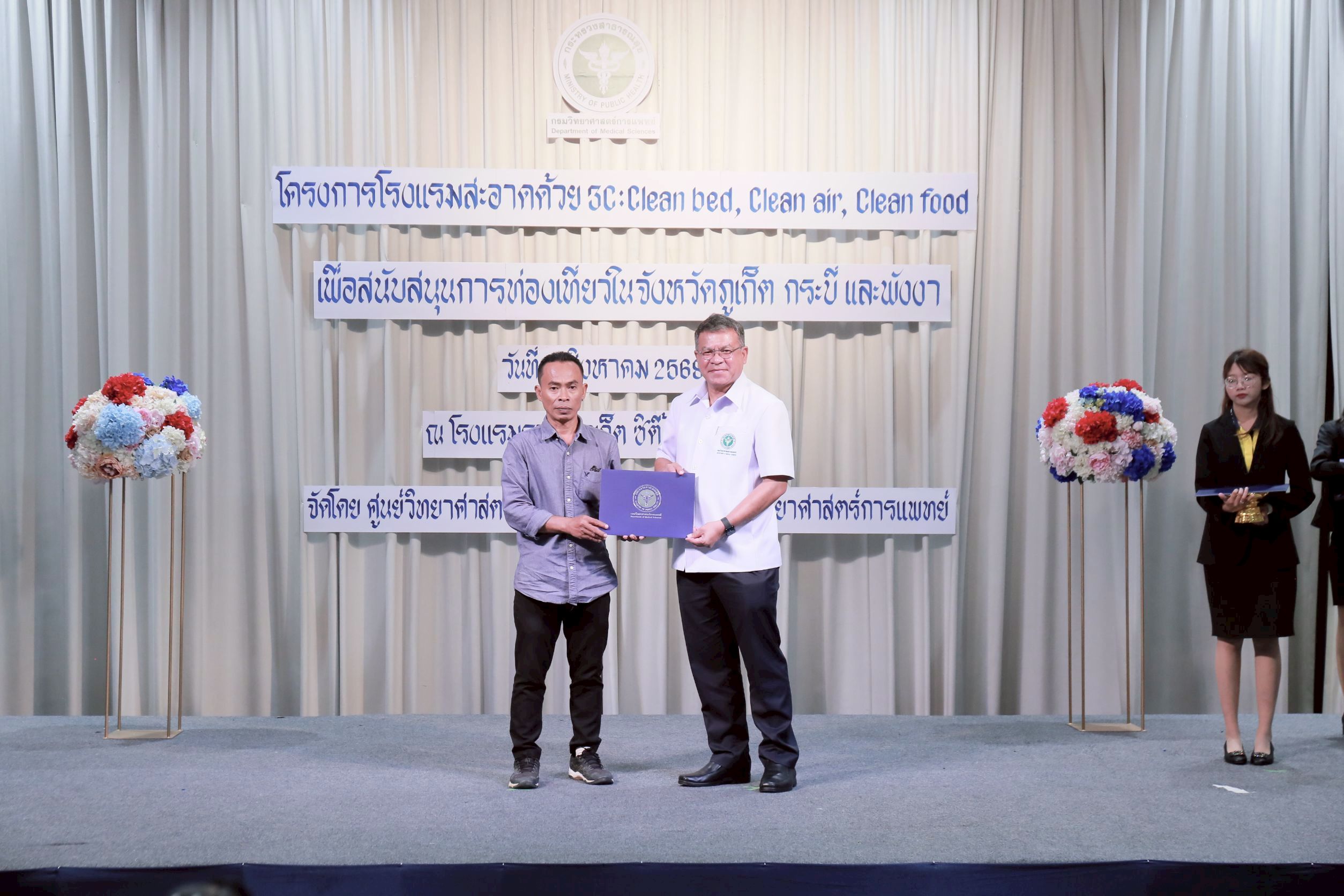 นายแพทย์ยงยศ ธรรมวุฒิ อธิบดีกรมวิทยาศาสตร์การแพทย์ เปิดเผยว่า กรมวิทยาศาสตร์การแพทย์ โดย ศูนย์วิทยาศาสตร์การแพทย์ที่ 11/1 ภูเก็ต ได้จัดทำโครงการโรงแรมสะอาดด้วย 3C : Clean bed, Clean air, Clean food เพื่อสนับสนุนการท่องเที่ยวของประเทศไทย โดยเฝ้าระวังตัวเรือด เชื้อลีจิโอเนลลา สาเหตุของโรคติดเชื้อทางเดินหายใจเฉียบพลัน เชื้อไวรัสโนโร สาเหตุของโรคทางเดินอาหารอักเสบเฉียบพลัน ในน้ำอุปโภคบริโภคของโรงแรม และสุขลักษณะครัวของโรงแรม โดยนำร่องให้ความรู้แก่ผู้ประกอบการ เจ้าหน้าที่โรงแรมในจังหวัดท่องเที่ยว ระดับ 3-5 ดาว หรือโรงแรมประเภท 3-4 ตามกฎกระทรวงมหาดไทย ในพื้นที่จังหวัดภูเก็ต กระบี่ และพังงา ซึ่งเฟสแรกมีโรงแรมที่ผ่านเกณฑ์ จำนวน 160 แห่ง และเฟสสองอยู่ระหว่างดำเนินการ จำนวน 40 แห่ง ดังนั้นจึงจัดให้มีพิธีมอบประกาศนียบัตรให้กับโรงแรมที่ผ่านการประเมินตามโครงการ 3C ในแฟสแรก พร้อมทั้งจัดประชุมถอดบทเรียนจากการดำเนินงาน เพื่อเป็นข้อมูลการดำเนินงานต่อไป