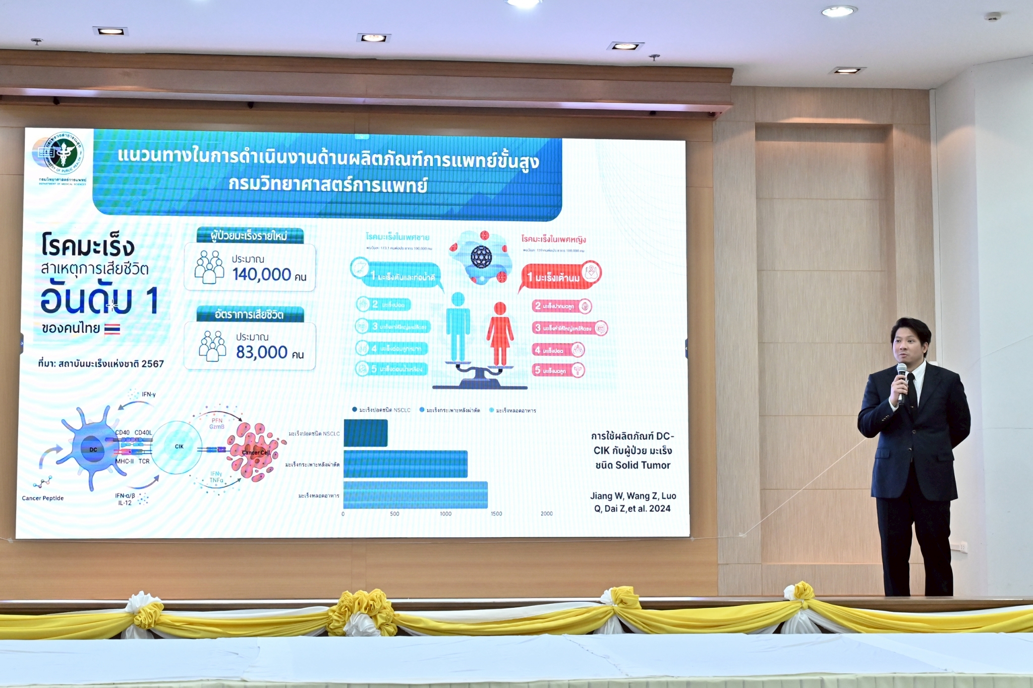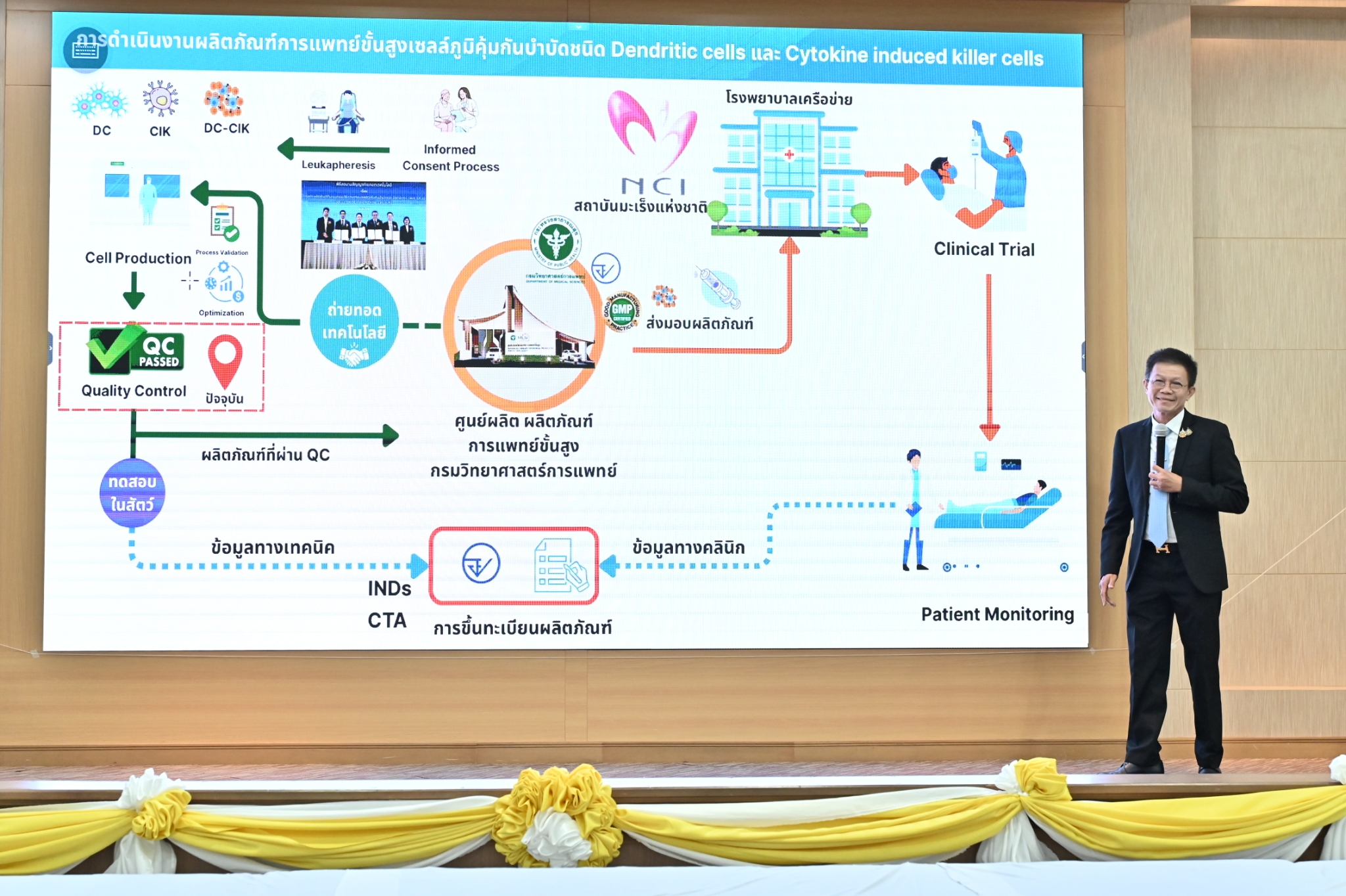 ดร.ปนัดดา เทพอัคศร ผู้อำนวยการสถาบันชีววิทยาศาสตร์ทางการแพทย์ กล่าวเพิ่มเติมว่า สถาบันชีววิทยาศาสตร์ทางการแพทย์ ได้ตระหนักถึงความสำคัญของการพัฒนาผลิตภัณฑ์การแพทย์ขั้นสูง ซึ่งที่ผ่านมา กรมวิทยาศาสตร์การแพทย์ ได้มีการพัฒนากรรมวิธีการผลิตผลิตภัณฑ์เซลล์ภูมิคุ้มกันบำบัดชนิด DC และ CIK จนสามารถถ่ายทอดเทคโนโลยีไปสู่ภาคเอกชน เพื่อให้สามารถดำเนินการต่อยอดสู่การผลิตและนำไปใช้ในงานวิจัยทางคลินิก ก่อนที่จะขยายผลสู่การใช้งานจริงในประชาชนไทย ซึ่งจะช่วยให้ประชาชนเข้าถึงการรักษาด้วยนวัตกรรมทางการแพทย์ขั้นสูงได้มากยิ่งขึ้น