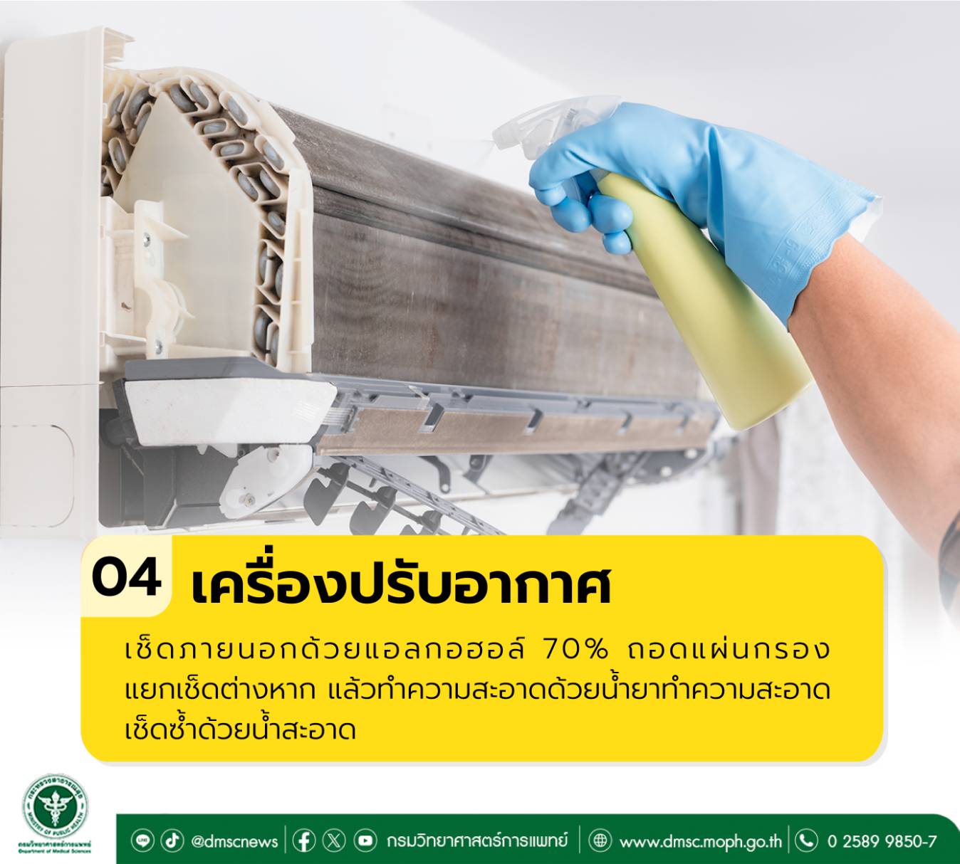 4. เครื่องปรับอากาศ > เช็ดภายนอกด้วยแอลกอฮอล์ 70% ถอดแผ่นกรองแยกเช็ดต่างหาก แล้วทำความสะอาดด้วยน้ำยาทำความสะอาด ทำให้แห้ง