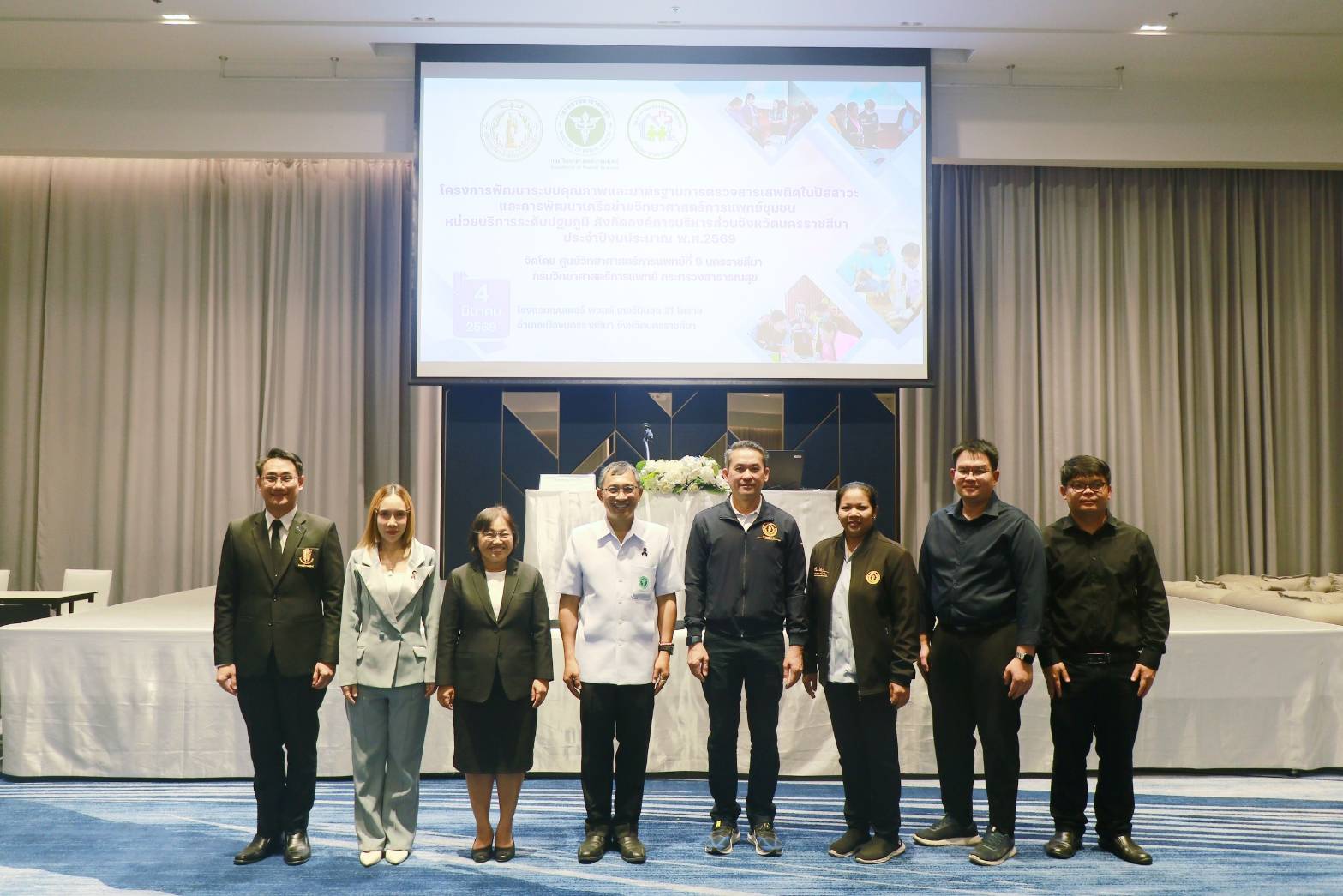 วันที่ 4 มีนาคม 2569 -  ดร.นพ.สราวุฒิ บุญสุข อธิบดีกรมวิทยาศาสตร์การแพทย์ มอบหมายให้ นพ.พิเชฐ บัญญัติ รองอธิบดีกรมวิทยาศาสตร์การแพทย์ เป็นประธานเปิด "โครงการพัฒนาระบบคุณภาพ และมาตราฐานการตรวจสารเสพติดในปัสสาวะ และพัฒนาเครือข่ายวิทยาศาสตร์การแพทย์ชุมชน หน่วยบริการระดับปฐมภูมิ สังกัดองค์การบริหารส่วนจังหวัดนครราชสีมา ประจำปีงบประมาณ พ.ศ.2569" โดยมี นางสาวอรทัย สุพรรณ ผู้อำนวยการศูนย์วิทยาศาสตร์การแพทย์ที่ 9 นครราชสีมา กล่าวรายงาน ทั้งนี้ผู้เข้าร่วมโครงการฯ ประกอบด้วย เจ้าหน้าที่หน่วยบริการระดับปฐมภูมิ, เจ้าหน้าที่กองสาธารณสุข สังกัดองค์การบริหารส่วนจังหวัดนครราชสีมา และเจ้าหน้าที่ศูนย์วิทยาศาสตร์การแพทย์ที่ 9 นครราชสีมา รวมทั้งสิ้น จำนวน 300 คน