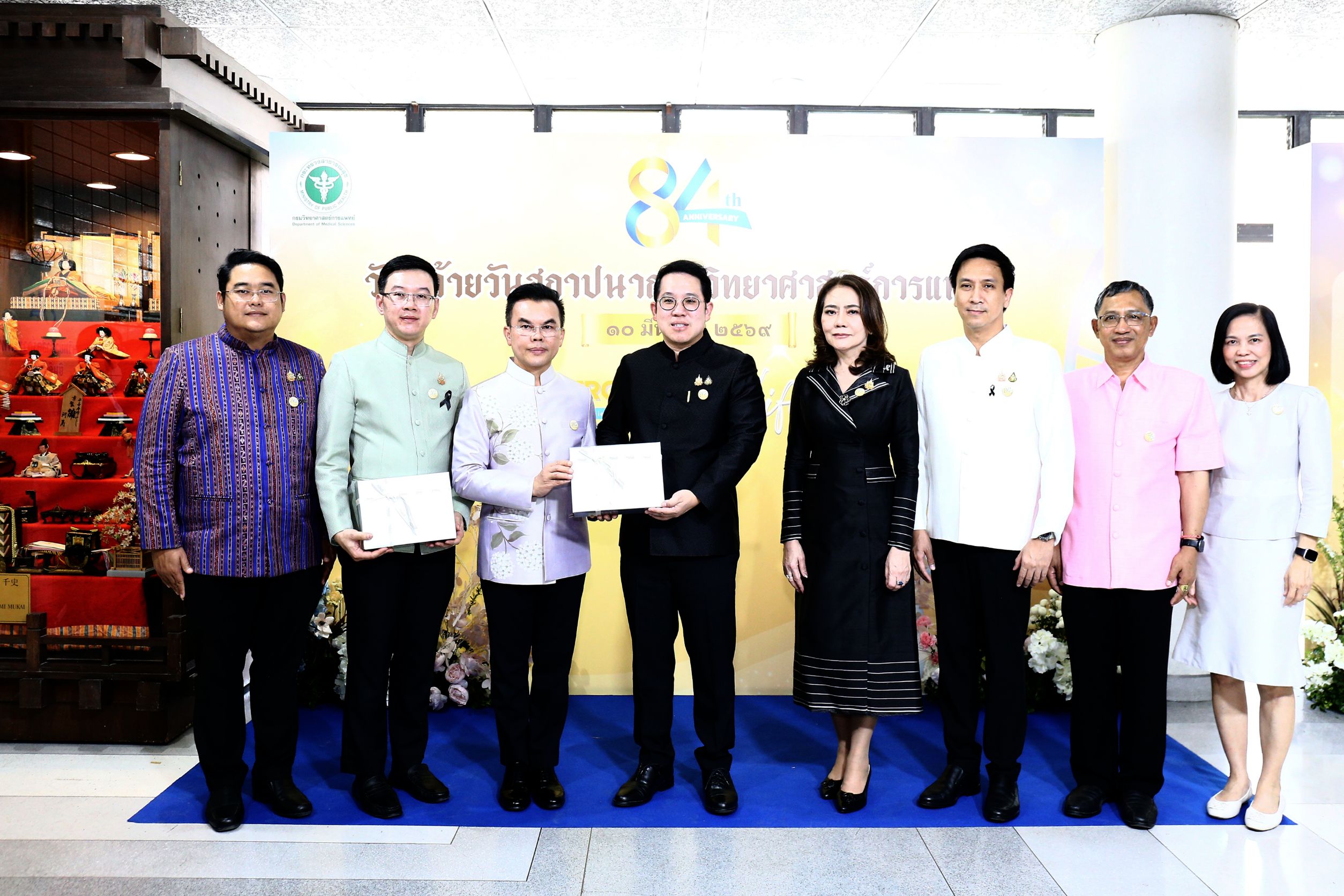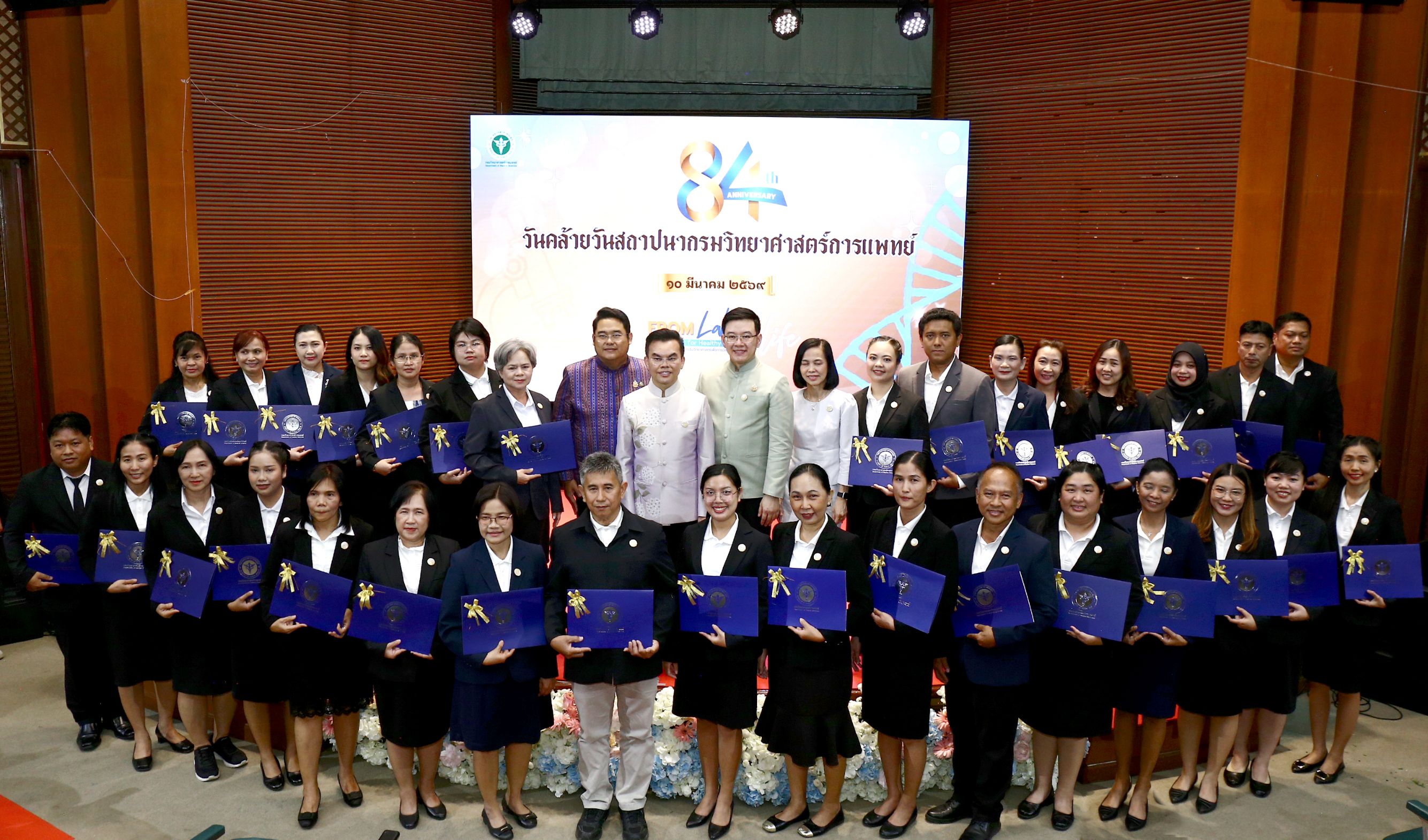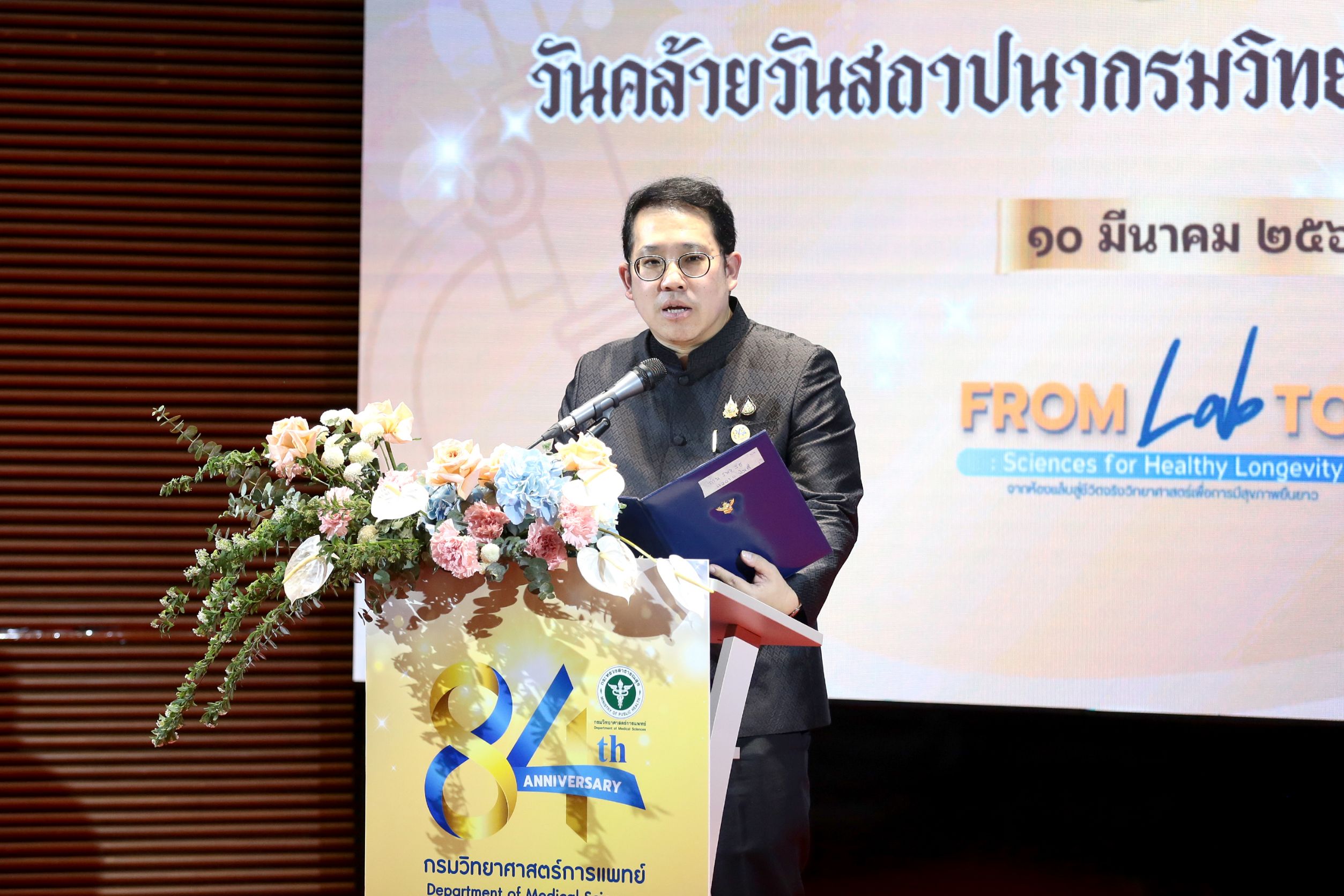 วันที่ 10 มีนาคม 2569 นายพัฒนา พร้อมพัฒน์ รัฐมนตรีว่าการกระทรวงสาธารณสุข เป็นประธานในพิธีเปิดงานวันคล้ายวันสถาปนา กรมวิทยาศาสตร์การแพทย์ ครบรอบ 84 ปี ภายใต้หัวข้อ “From Lab to Life : Sciences for Healthy Longevity จากห้องแล็บสู่ชีวิตจริง วิทยาศาสตร์การแพทย์เพื่อการมีสุขภาพที่ยืนยาว” พร้อมมอบรางวัลแก่ข้าราชการพลเรือนดีเด่น คนดีศรีกรม และบุคลากรดีเด่น ประจำปีงบประมาณ พ.ศ. 2568 โดยมี นายยอดศักดิ์ รักษาแก้ว ที่ปรึกษารัฐมนตรีว่าการกระทรวงสาธารณสุข นางสาวจิตศ์ตราฎ์ หมีทองธนกรณ์ เลขานุการรัฐมนตรีว่าการกระทรวงสาธารณสุข ดร.นพ.สราวุฒิ บุญสุข อธิบดีกรมวิทยาศาสตร์การแพทย์ ผู้บริหาร อดีตผู้บริหารกระทรวงสาธารณสุข ภาคีเครือข่ายภาครัฐและเอกชน รวมทั้งบุคลากรกรมวิทยาศาสตร์การแพทย์จากส่วนกลางและส่วนภูมิภาคเข้าร่วมงาน ณ กรมวิทยาศาสตร์การแพทย์ จังหวัดนนทบุรี