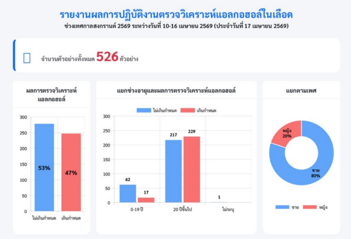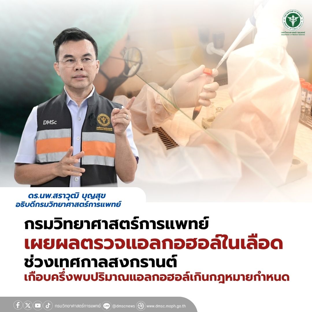 ดร.นพ.สราวุฒิ บุญสุข อธิบดีกรมวิทยาศาสตร์การแพทย์ เปิดเผยว่า ในช่วงเทศกาลสงกรานต์ที่ผ่านมา กรมวิทยาศาสตร์การแพทย์ ได้รับตัวอย่างเพื่อตรวจวิเคราะห์ปริมาณแอลกอฮอล์ในเลือด ในช่วง 7 วันควบคุมเข้ม ระหว่างวันที่ 10 – 16 เมษายน 2569 จำนวน 526 ตัวอย่าง พบผู้มีปริมาณแอลกอฮอล์เกินกฎหมายกำหนดร้อยละ 47 โดยกลุ่มอายุที่ประสบอุบัติเหตุมากที่สุดคือ 20 – 29 ปี พร้อมทั้งรายงานผลการตรวจวิเคราะห์ภายใน 24 ชั่วโมง ให้กับหน่วยงานที่ส่งตรวจแล้ว พร้อมเน้นย้ำดื่มไม่ขับเพื่อความปลอดภัยในชีวิตและทรัพย์สิน
