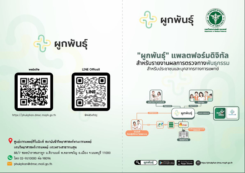 ด้าน ดร.ปนัดดา กล่าวเพิ่มเติมว่า ปัจจุบันการตรวจยีนแพ้ยาได้บรรจุอยู่ในสิทธิประโยชน์ระบบบัตรทอง 30 บาท ประกันสังคม และสวัสดิการรักษาพยาบาลข้าราชการ โดยเป็นผู้ป่วยที่มีข้อบ่งชี้ตามความเห็นของแพทย์ สามารถส่งตรวจที่กรมวิทยาศาสตร์การแพทย์ส่วนกลาง คือ สถาบันชีววิทยาศาสตร์ทางการแพทย์ และส่วนภูมิภาค ศูนย์วิทยาศาสตร์การแพทย์ ซึ่งมีทั้งหมด 14 แห่งทั่วประเทศ เชียงใหม่ เชียงราย พิษณุโลก นครสวรรค์ สมุทรสงคราม ชลบุรี ขอนแก่น อุดรธานี นครราชสีมา อุบลราชธานี สุราษฎร์ธานี ภูเก็ต สงขลา และตรัง นอกจากนี้ยังมีห้องปฏิบัติการของโรงเรียนแพทย์ที่สามารถตรวจยีนแพ้ยาได้เช่นกัน ทั้งนี้ สำหรับโรงพยาบาลที่สนใจใช้งานแพลตฟอร์มดิจิทัล “ผูกพันธุ์” สามารถติดต่อสอบถามรายละเอียดได้ที่ ศูนย์การแพทย์จีโนมิกส์ สถาบันชีววิทยาศาสตร์ทางการแพทย์ กรมวิทยาศาสตร์การแพทย์ โทร. 02 951 0000 ต่อ 98095, 98096 หรือเว็บไซต์ http://phukphan.dmsc.moph.go.th. และศูนย์วิทยาศาสตร์การแพทย์ 14 แห่งทั่วประเทศ